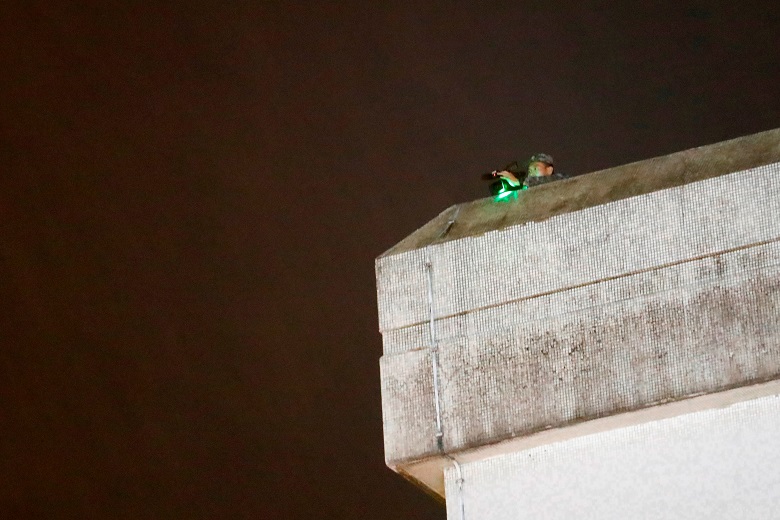A People's Liberation Army soldier films from the rooftop of a building outside Osborn Barracks during a demonstration following the Hong Kong government's ban on face masks under emergency law, on Oct 6, 2019.