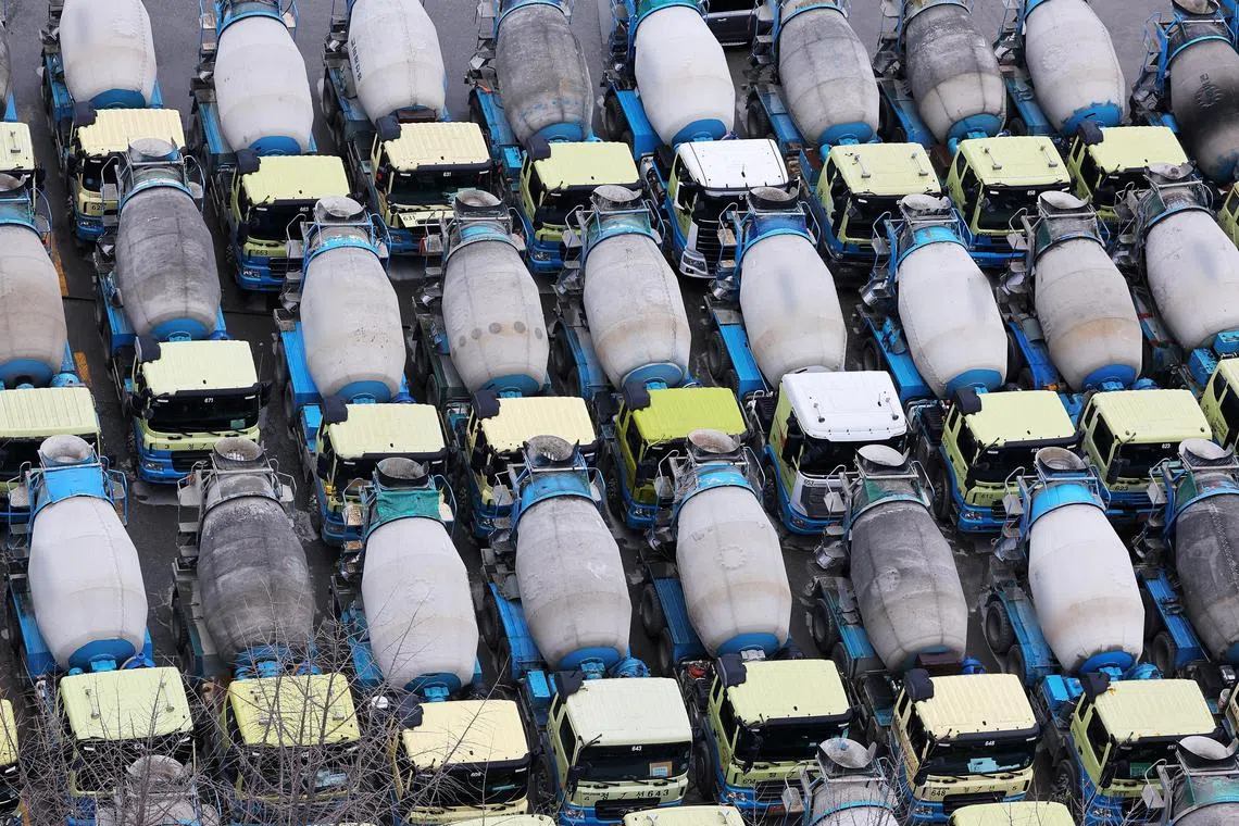 Concrete mixer trucks are parked at a factory due to a strike by a truckers’ union in Anyang, South Korea, on Nov 28, 2022.