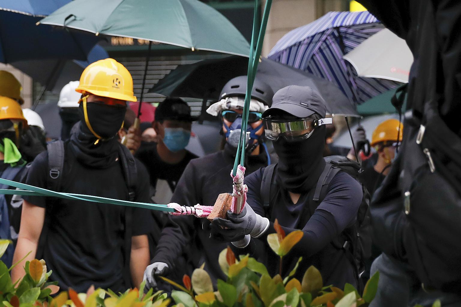 Protesters using a sling shot to throw bricks at the Tseung Kwan O police station during a protest in Hong Kong on Aug 4, 2019.