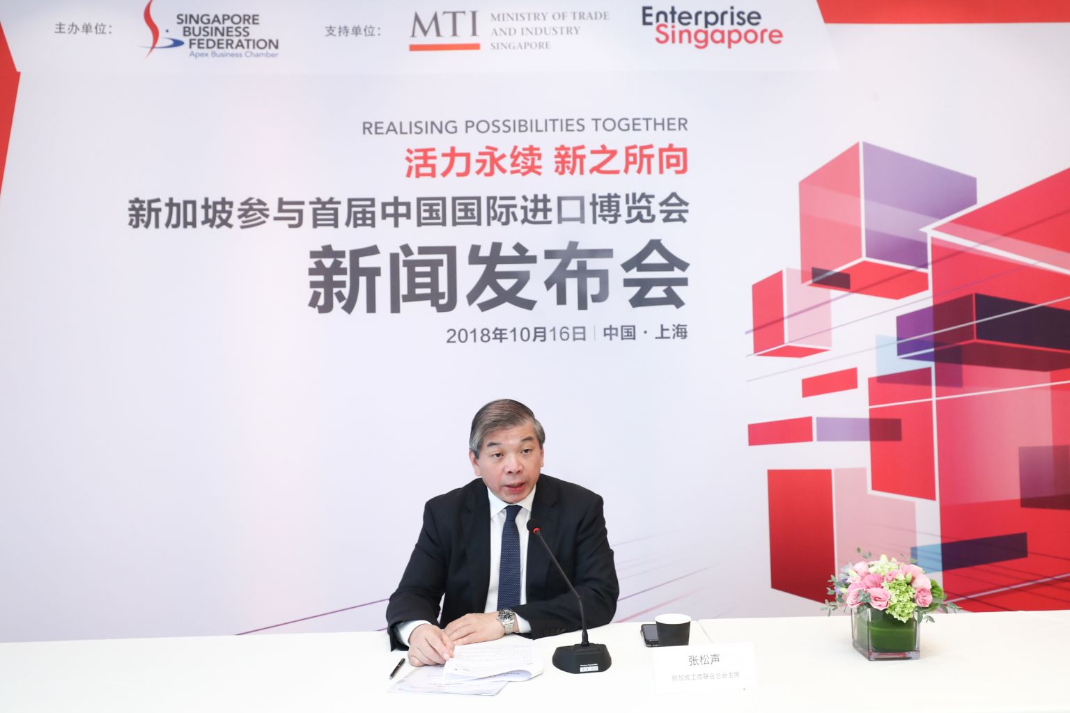 Singapore Business Federation chairman Teo Siong Seng speaking at a press briefing in Shanghai on Oct 16, 2018, on Singapore companies' participation at the inaugural China International Import Expo.
