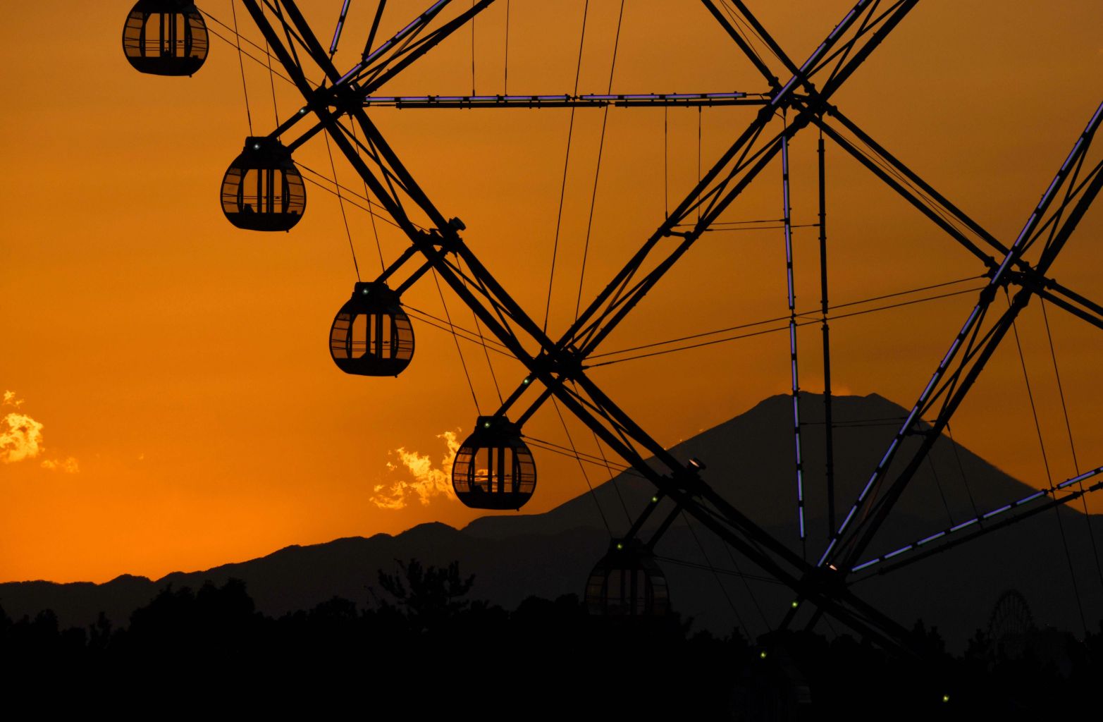 Mount Fuji is seen in the background over a ferris wheel during sunset at Kasai Rinkai Park in Tokyo.