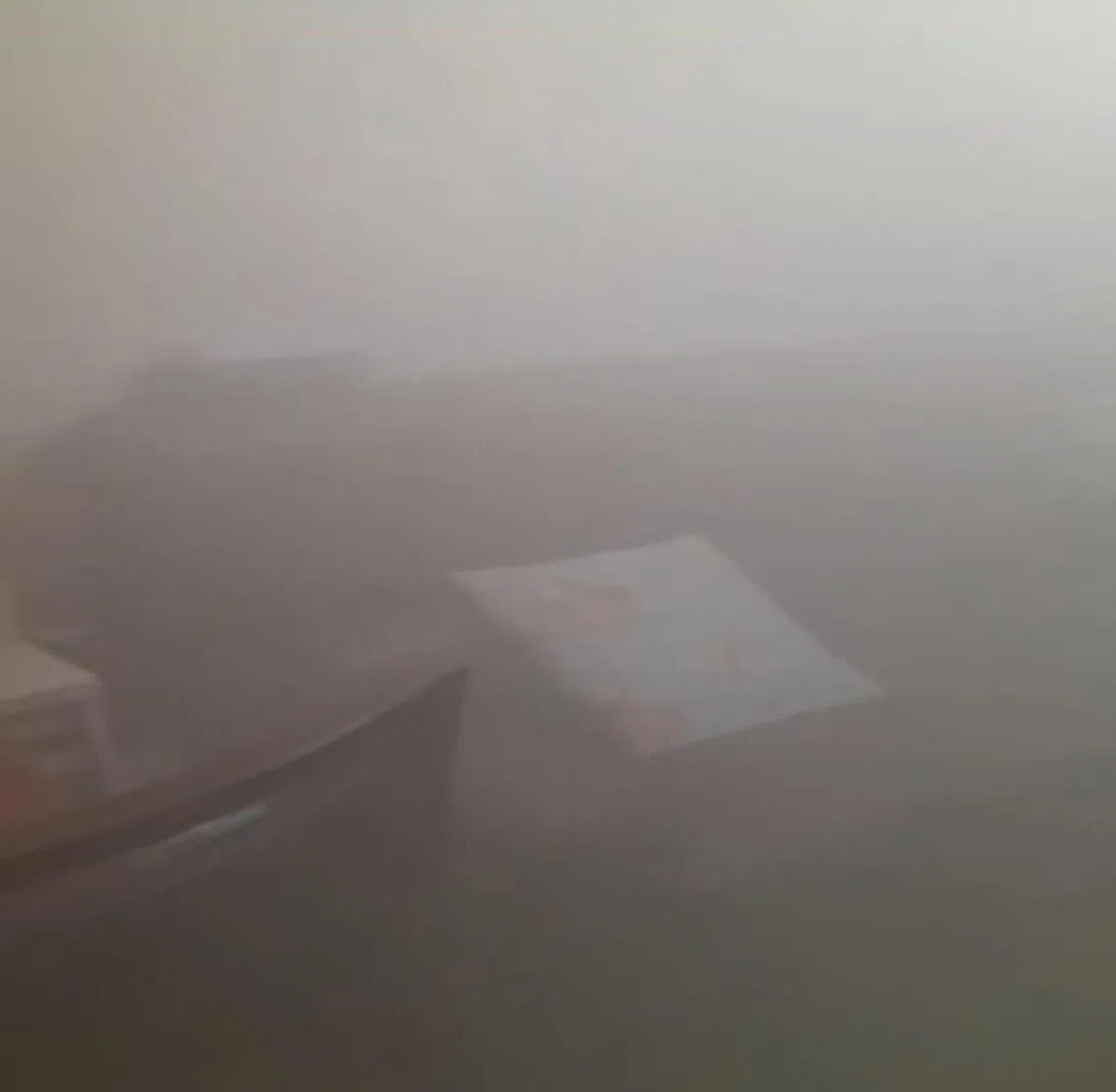 The 11-second clip pans across a smoke-filled room, where a younger woman is seen crouching and holding a piece of cloth to her nose, while a frail old woman – who appears to be her elderly charge – sits motionless at a table.