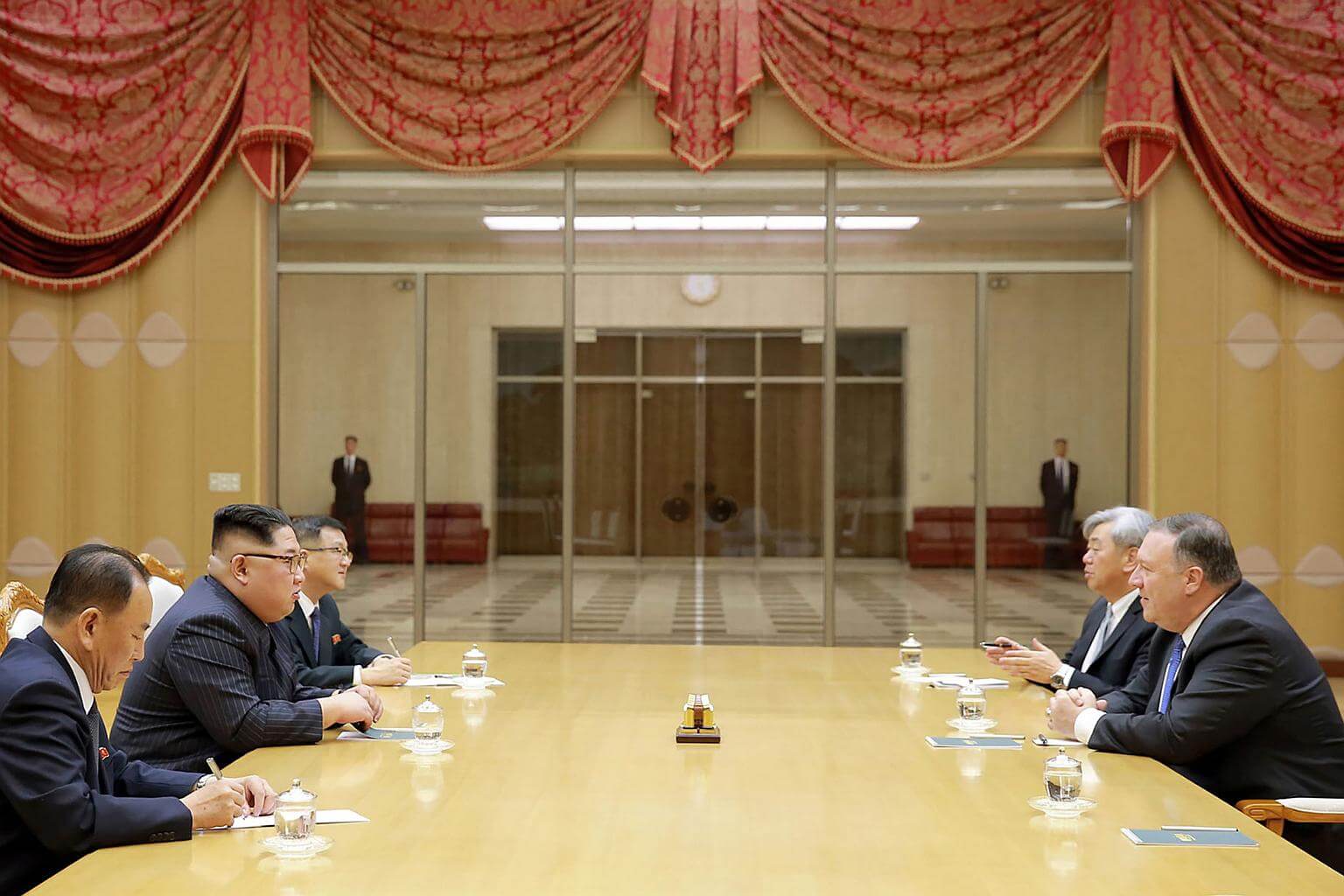 North Korean leader Kim Jong Un (second, left) meeting with US Secretary of State Mike Pompeo (right) at the Workers' Party of Korea headquarters in Pyongyang. Seated next to Mr Pompeo is Mr Andrew Kim, the head of the CIA's Korea Mission Centre.