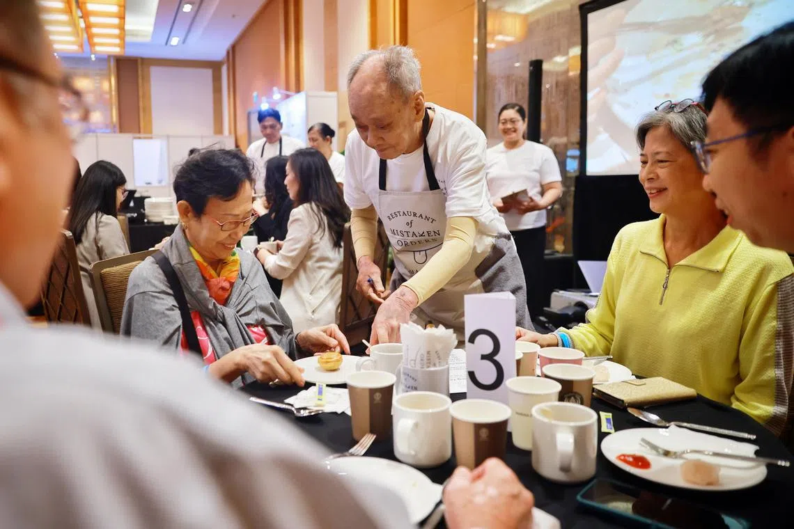 Server Lim Heng See, 83, serving a customer at pop-up cafe Restaurant of Mistaken Orders at the 14th World Ageing Festival in Singapore in May.