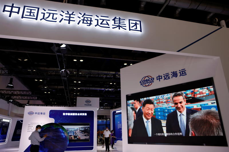 A screen displays video footage of Chinese President Xi Jinping's visit to a port in Greece, at the Cosco Shipping booth during the 2021 China International Fair for Trade in Services (CIFTIS) in Beijing, China on Sept 4, 2021.