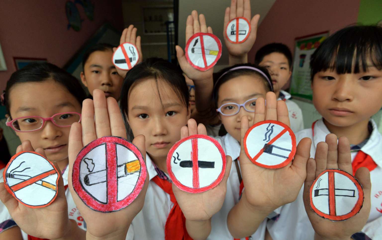 Students with no smoking signs to support World No Tobacco Day at a primary school in Handan, northern China's Hebei province, on May 30, 2016.