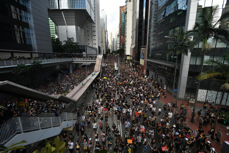 Protesters in Hennessy Road next to the police headquarters during the annual pro-democracy march in Hong Kong on July 1, 2019.