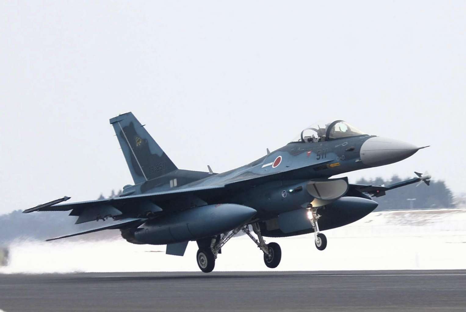 An F-2 fighter takes off from a runway at the ASDF's Misawa Air Base.