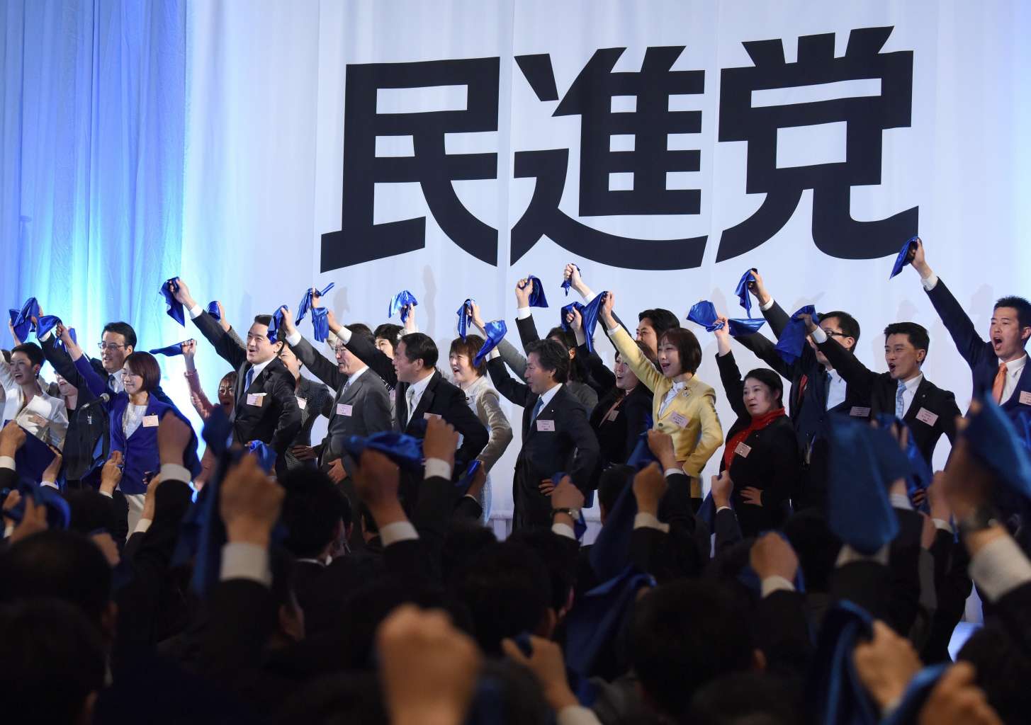 Parliament members of the main opposition Democratic Party wave blue handkerchiefs during the party's inauguration ceremony in Tokyo on March 27, 2016.