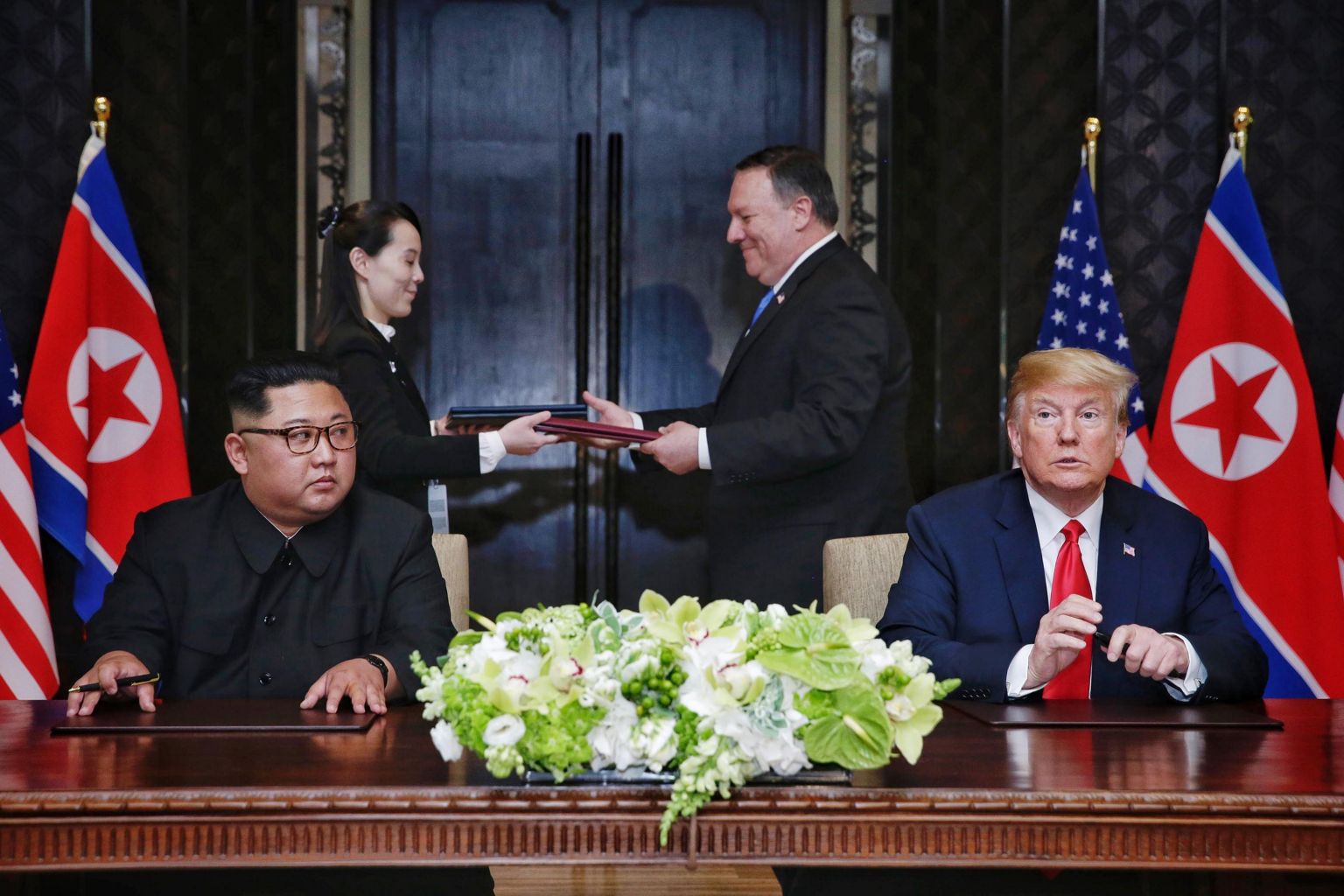 US President Donald Trump and North Korean leader Kim Jong Un at the Capella hotel on Sentosa Island, Singapore, on June 12, 2018.