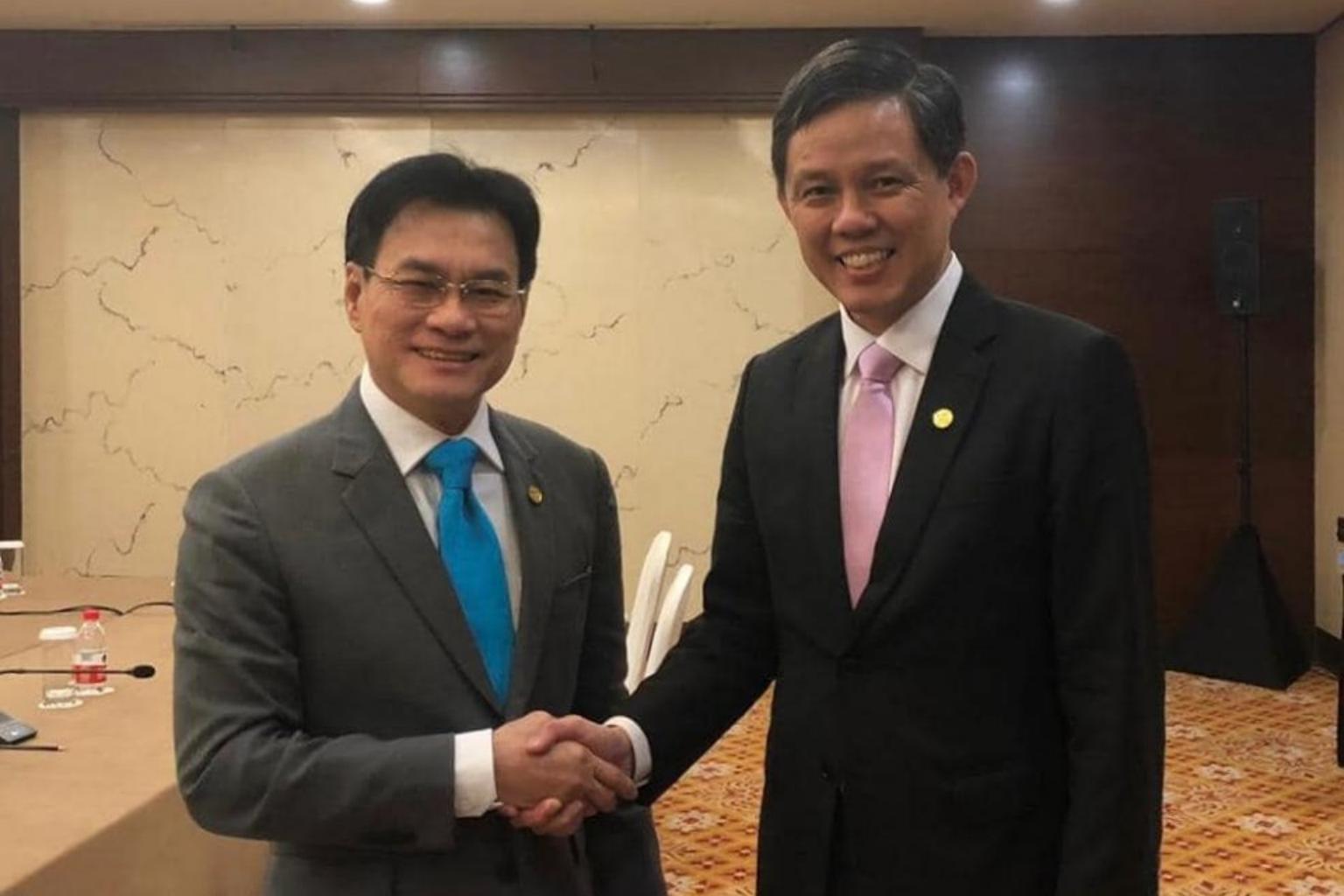 Trade and Industry Minister Chan Chun Sing with Thai Deputy Prime Minister and Minister of Commerce Jurin Laksanawisit on the sidelines of the Asean Economic Ministers Caucus Meeting on Aug 2, 2019.