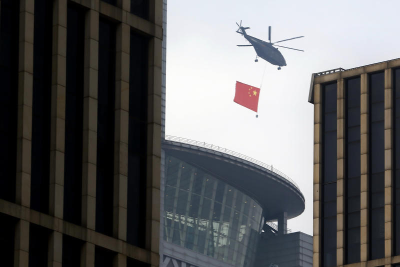 A helicopter carrying the Chinese flag flying above the central business district in Beijing on Sept 15, 2019.
