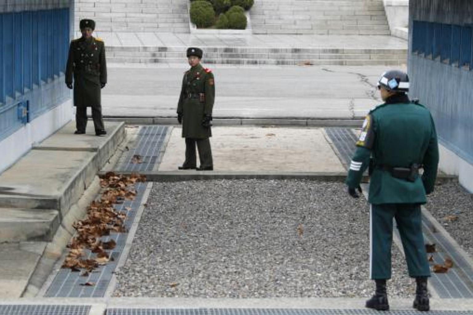 North Korean soldiers look across a concrete border as a South Korean soldier (right) stands guard at the truce village of Panmunjom.