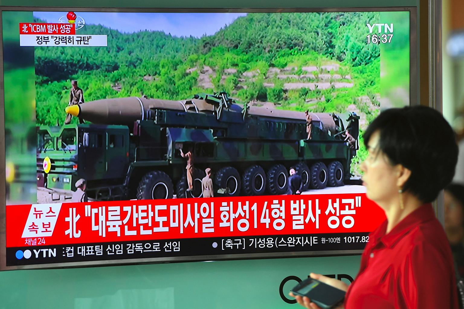 A woman walks past a television screen showing a picture of North Korea's launch of an intercontinental ballistic missile (ICBM), at a railway station in Seoul on July 4, 2017.