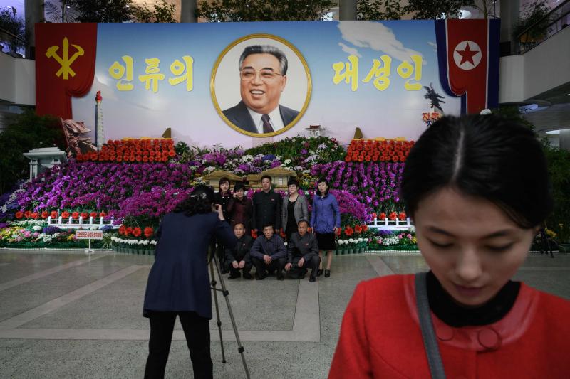 Visitors posing for a photo in front of a portrait of late North Korean leader Kim Il Sung in Pyongyang on April 13, 2018. The country commemorated the birth of Kim Il Sung on Sunday.