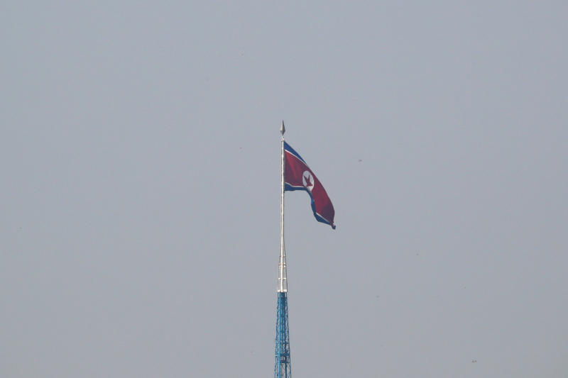 A North Korean flag flutters on top of a tower at North Korea's propaganda village of Gijungdong.