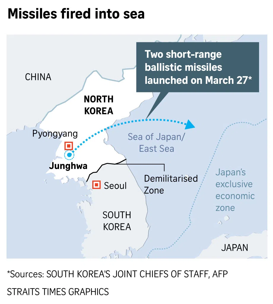 Seoul – North Korea fired two short-range ballistic missiles off its east coast on Monday morning, South Korea’s military said, just as a US aircraft carrier staged combined naval exercises with South Korea in a warning to Pyongyang.