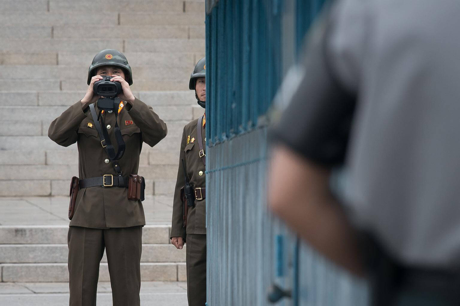 North Korean soldiers at the military demarcation line separating North and South Korea at the truce village of Panmunjom.