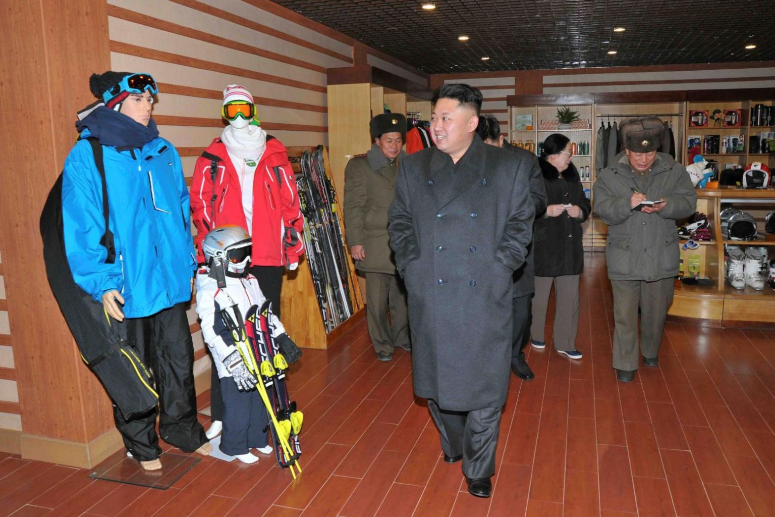 North Korean leader Kim Jong Un (front) visiting the Masik-Ryong Ski Resort.