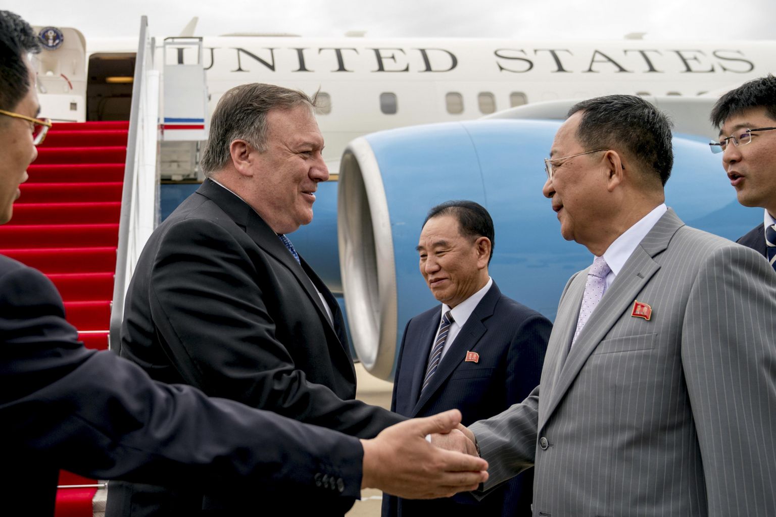 US Secretary of State Mike Pompeo (second from left) meeting Foreign Minister Ri Yong Ho and other North Korean officials at the airport in Pyongyang, North Korea, July 6, 2018.