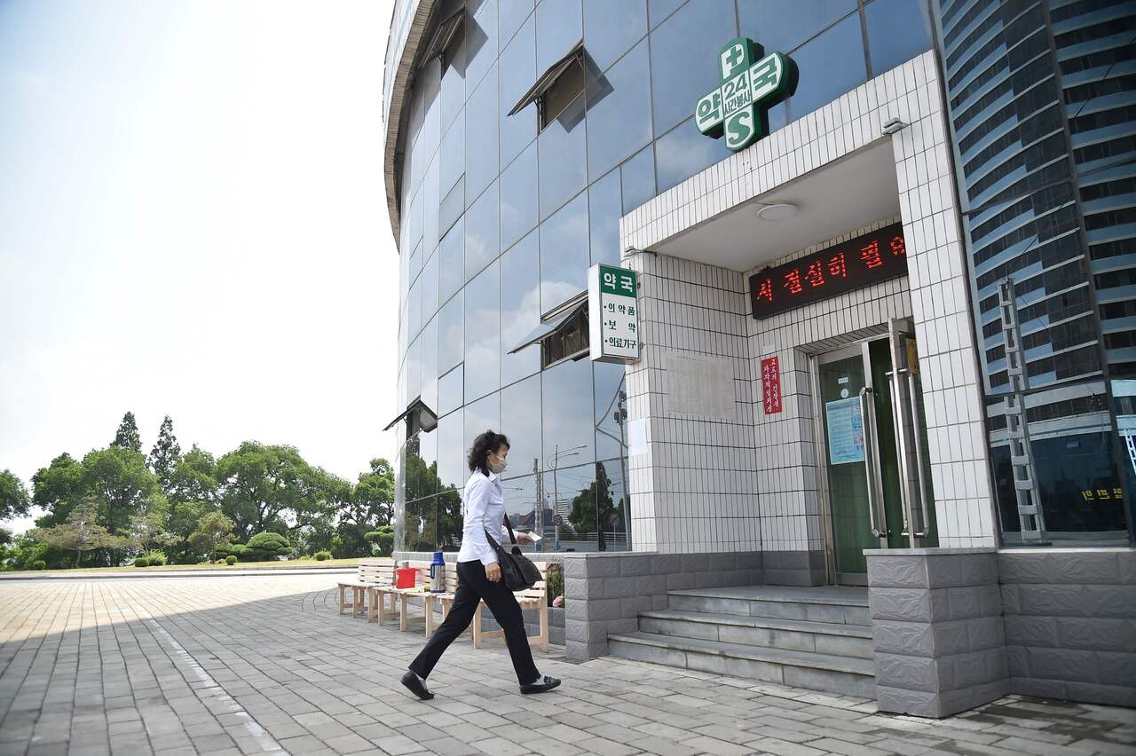 A woman walks into a pharmacy to purchase medicine in Pyongyang on May 27, 2022.
