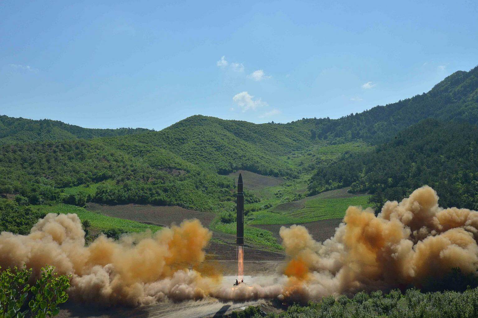 The intercontinental ballistic missile Hwasong-14 is seen during its test launch in Pyongyang, on July 4, 2017.