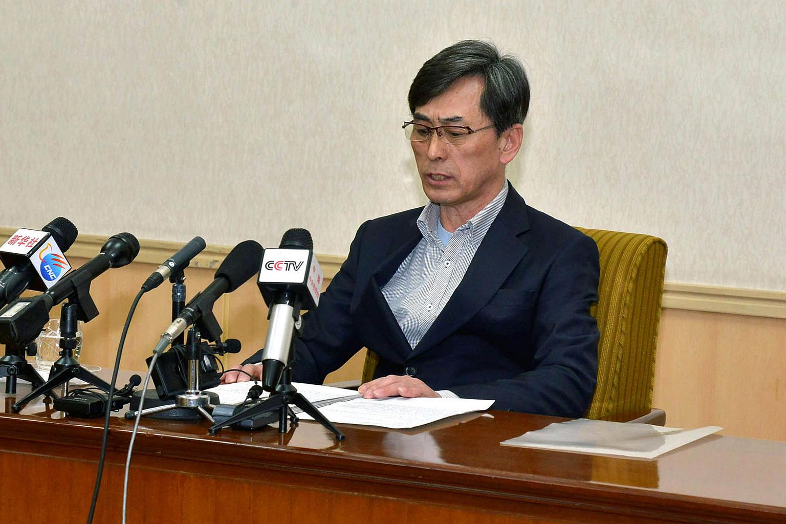 This picture taken by North Korea's official Korean Central News Agency (KCNA) on March 26, 2015 shows South Korean Kim Kuk Gi speaking at a press conference at the People's Palace of Culture in Pyongyang. Kim and Choe Chun Gil, whom Pyongyang accused of being spies for South Korea, were sentenced to hard labour for life, reported the Yonhap news agency on June 23, 2015.