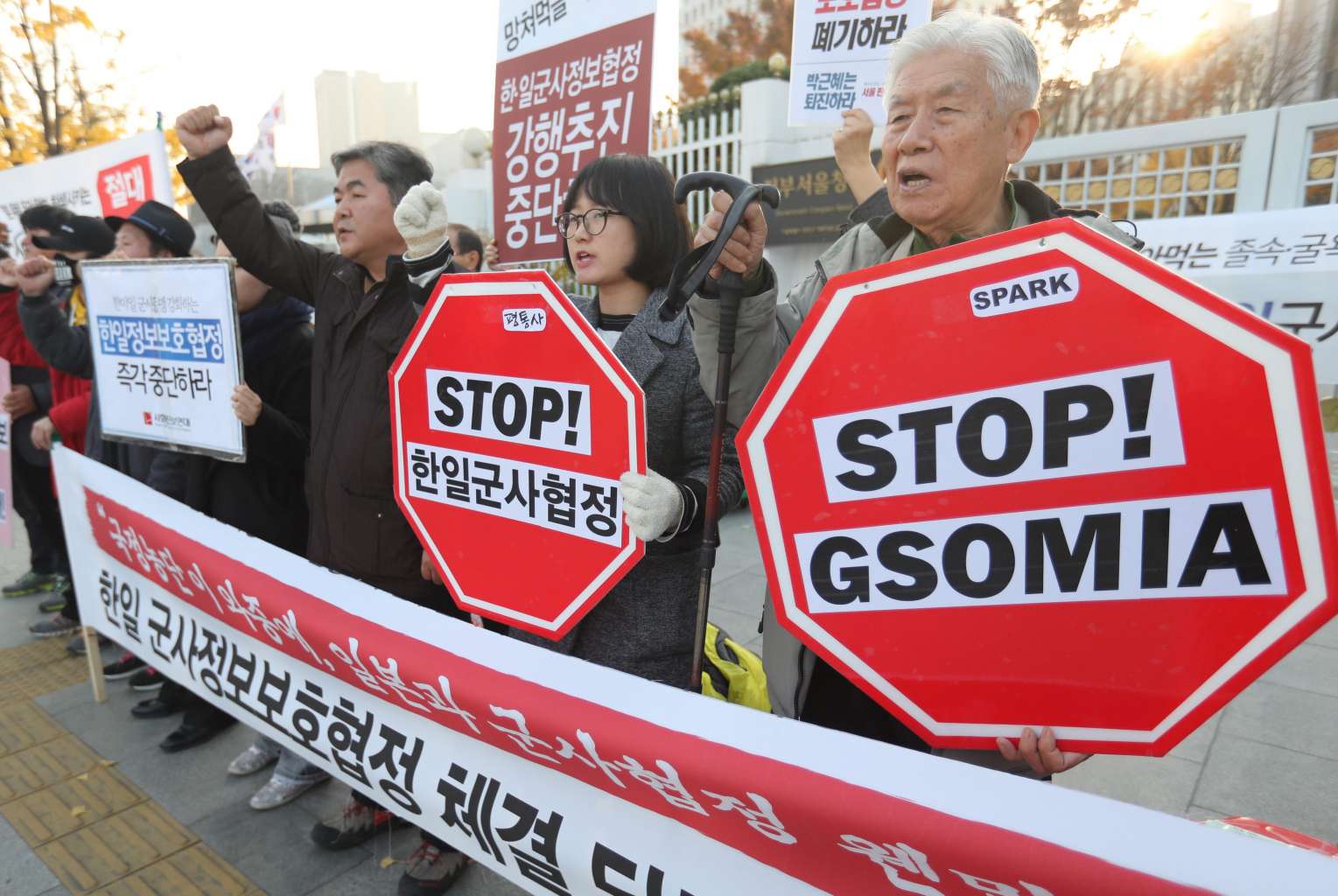 Activists hold a rally in front of the government complex in Seoul, South Korea on Nov 17, 2016, to call on the government to stop its push for a formal agreement with Japan on the sharing of military intelligence on North Korea.
