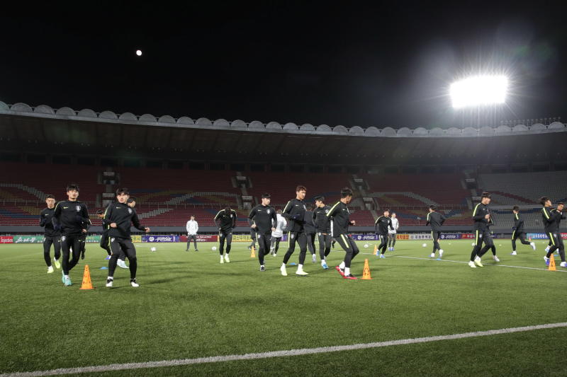 South Korea's national soccer team train at the Kim Il-sung Stadium in Pyongyang, North Korea, on Oct 14, 2019. The match is the first one the South Korean men's national team has played in North Korea since a friendly in 1990.