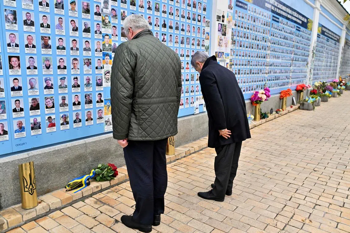 Ukraine’s Foreign Minister Andrii Sybiha (left) and Japan’s Foreign Minister Takeshi Iwaya standing before the Memory Wall of Fallen Ukrainian Defenders in Kyiv, on Nov 16.