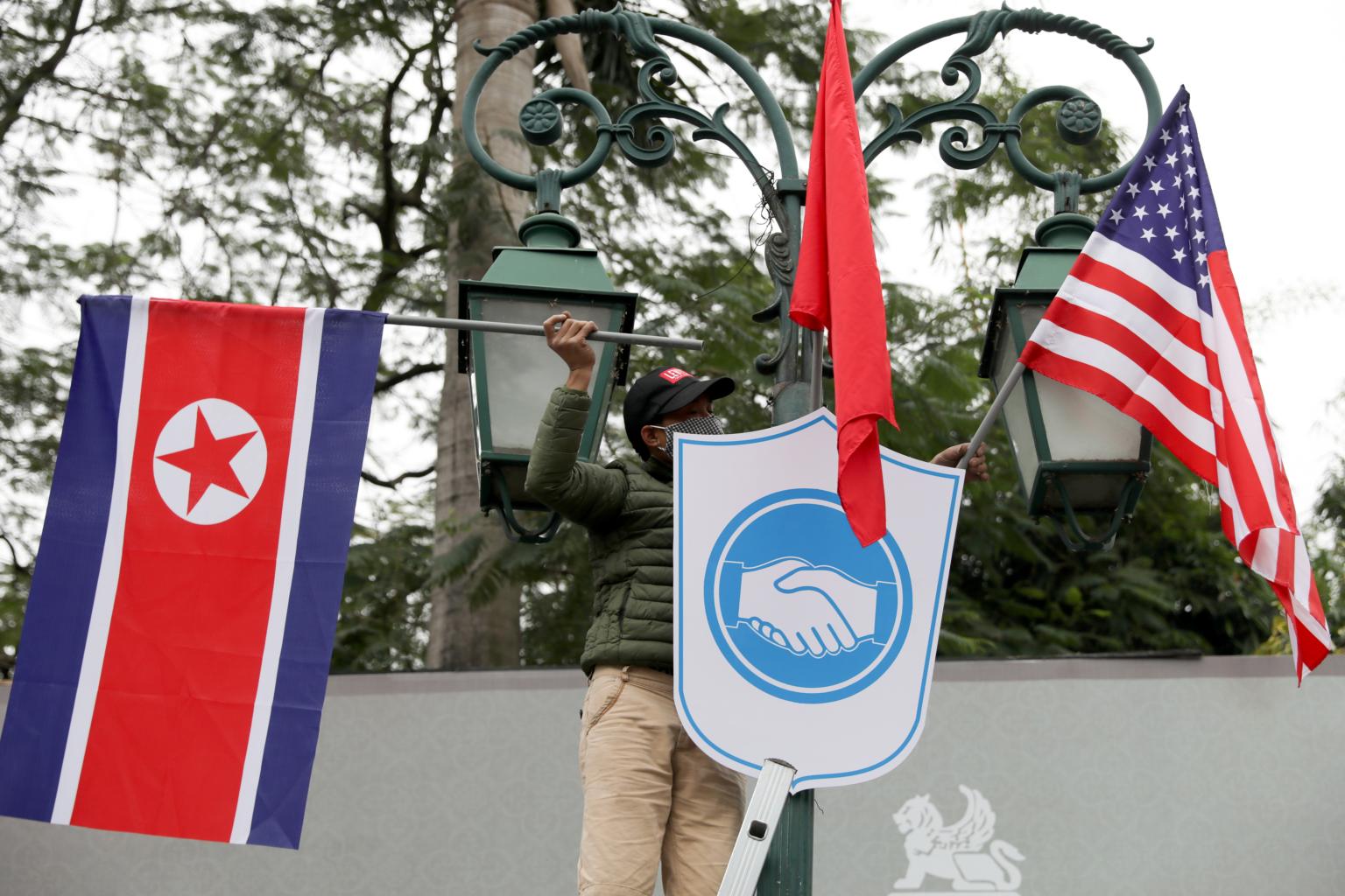 In a photo taken on Feb 22, a man places North Korean and US flags outside the Opera House, ahead of the Trump-Kim summit in Hanoi.