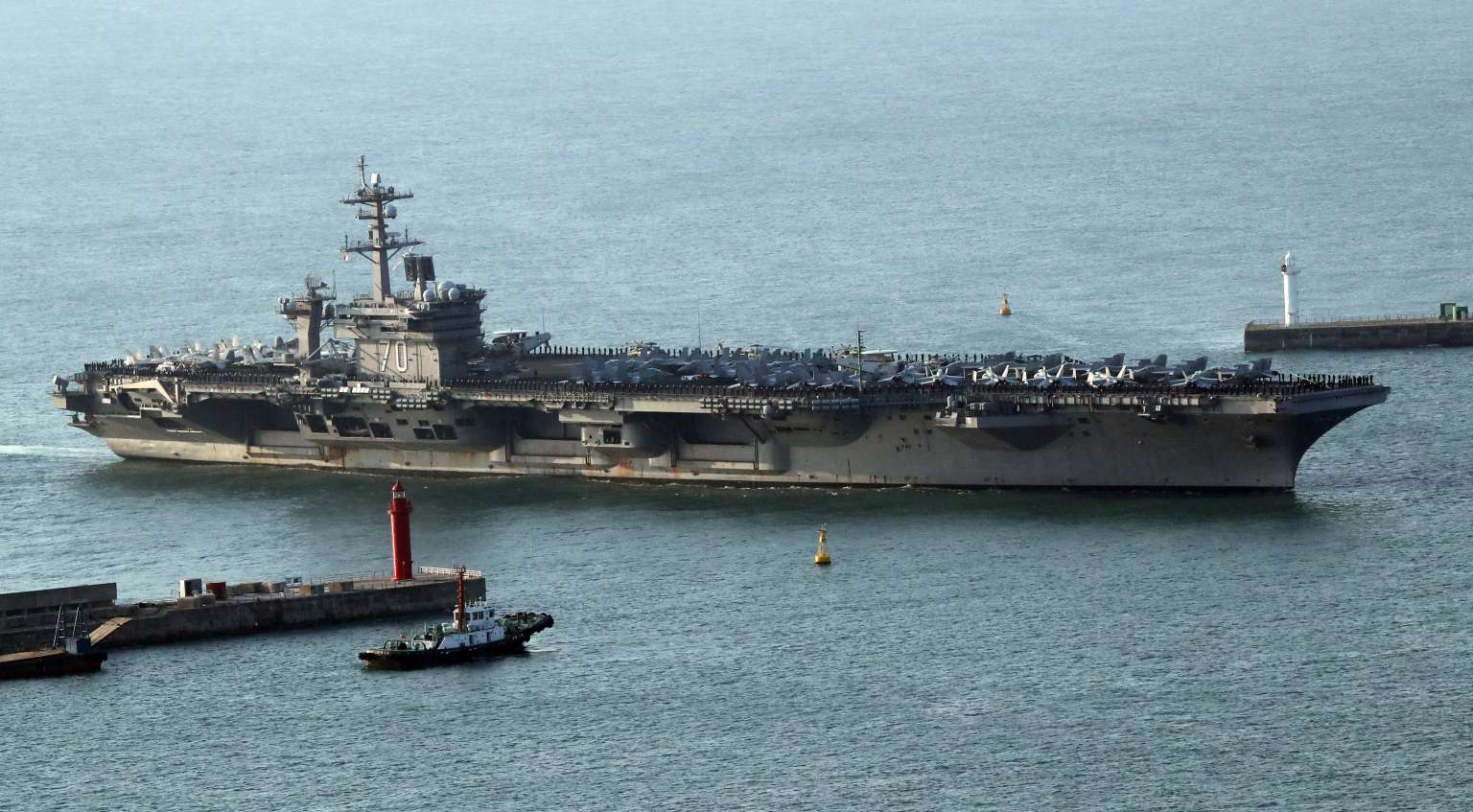 The USS Carl Vinson supercarrier arrives at a port in Busan, South Korea, on March 15, 2017.