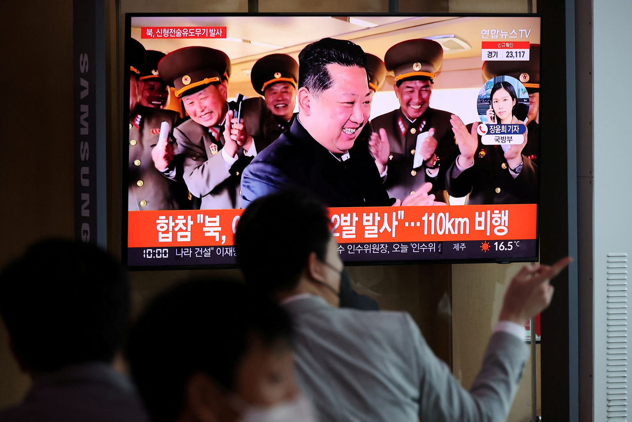 A televised North Korean news report of its new guided weapon test, at a railway station in Seoul, on April 17, 2022.