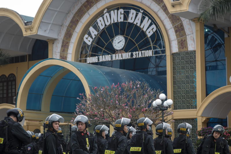 Security personnel assemble in front of the Dong Dang Railway Station, where North Korean leader Kim Jong-Un is expected to arrive by train, in Dong Dang, Vietnam, on Feb 25, 2019.