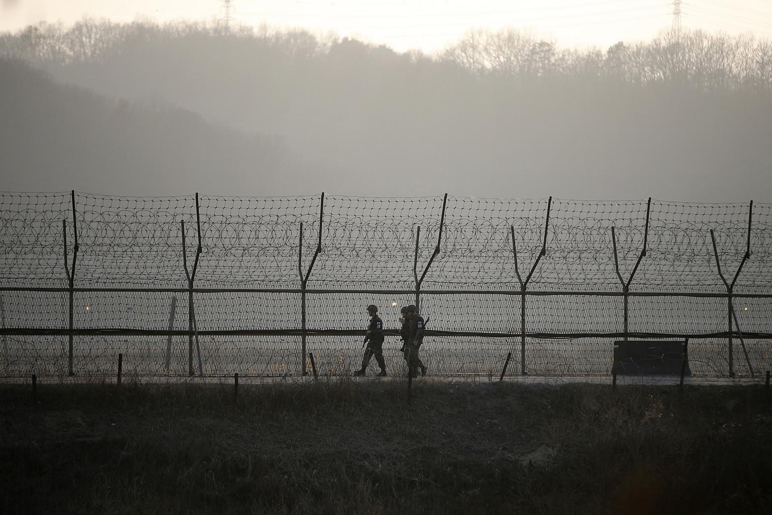 South Korean soldiers on patrol near the demilitarised zone separating the two Koreas in Paju on March 21, 2016.