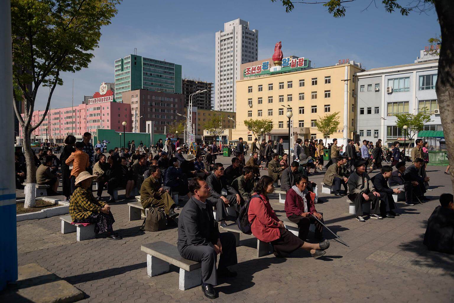 A file photo of people watching a public television screen showing coverage of the 'Third Plenary Meeting' of the ruling Workers' Party, in Pyongyang on April 21, 2018.