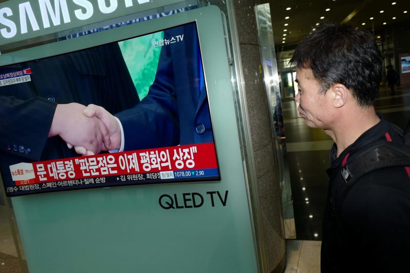 A public screen shows news coverage of South Korea's President Moon Jae In and North Korean leader Kim Jong Un shaking hands during their inter-Korean summit meeting, at a railway station in Seoul on April 27, 2018.