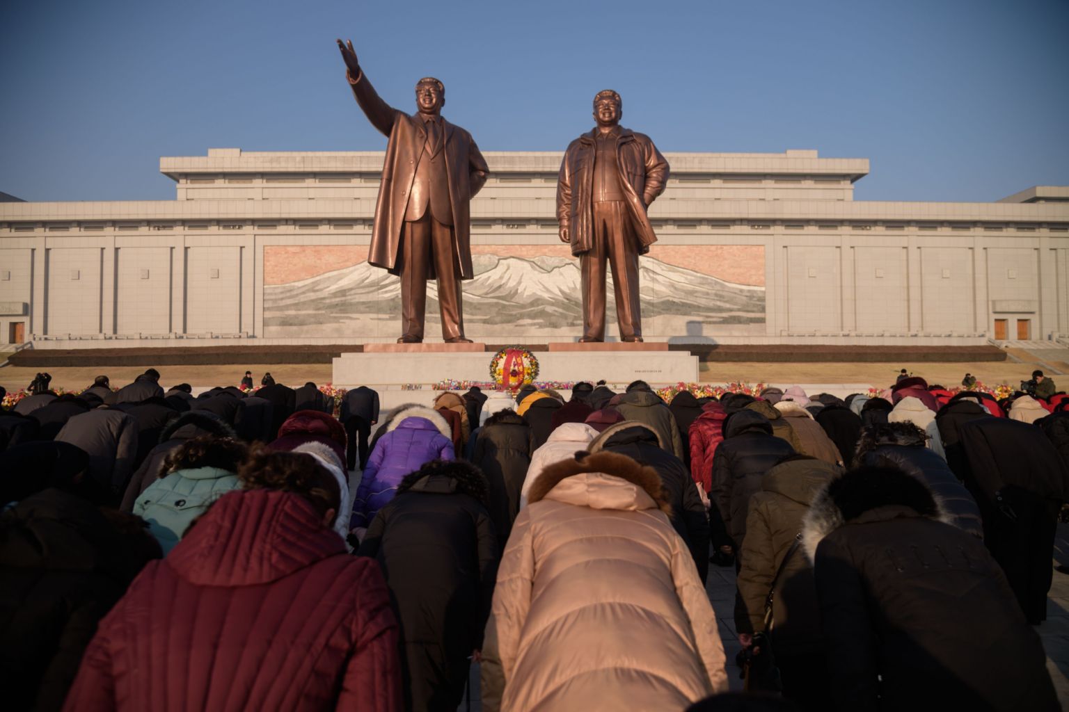 People bow before the statues of late North Korean leaders Kim Il Sung and Kim Jong Il on Mansu Hill, North Korea, on Feb 8, 2020.