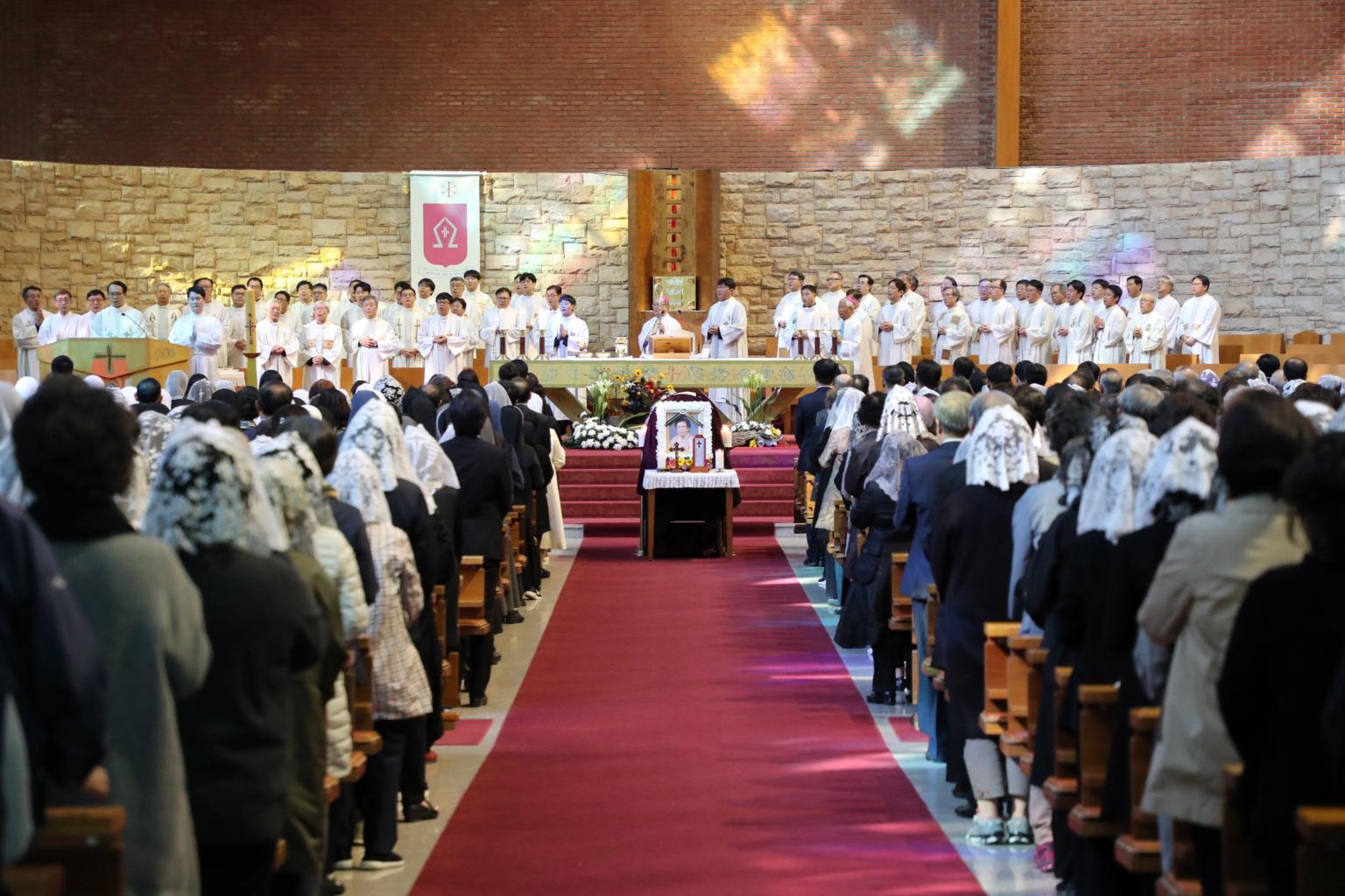People attend the funeral mass for Kang Han-ok, mother of South Korean President Moon Jae-in, at the Namcheon Catholic Cathedral in Busan, South Korea, on Oct 31, 2019.