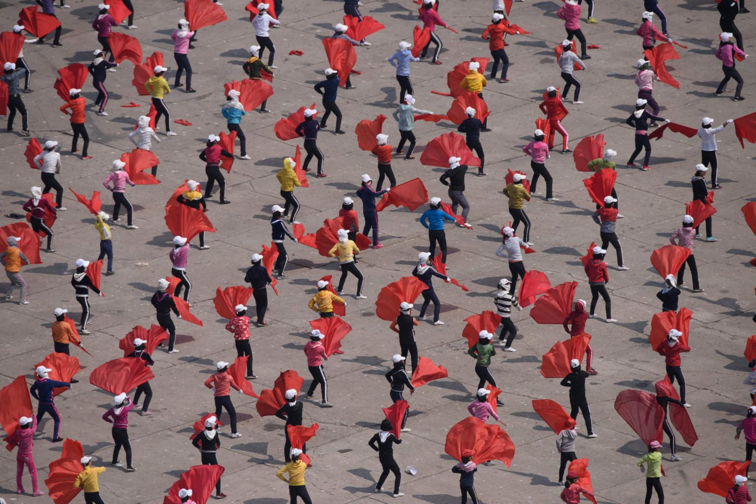 Participants attend a rehearsal understood to be for a 'mass games' performance in Pyongyang on April 12, 2019.