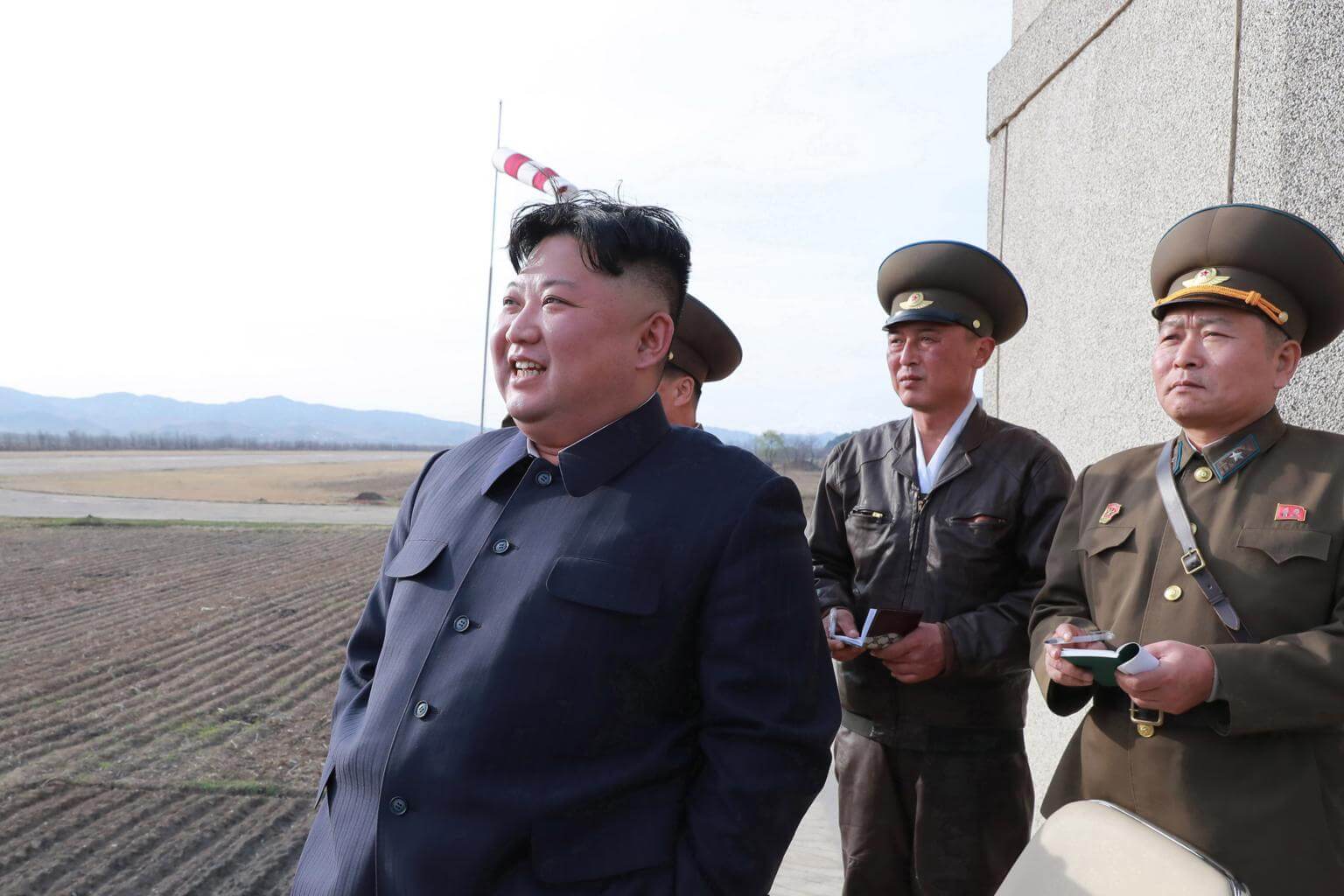 North Korean Leader Kim Jong Un (left) attends a flight training of Korean People's Army Air Force on April 16, 2019.