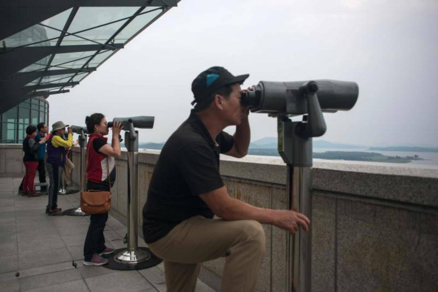 Visitors look through binoculars towards North Korea at the Odusan observatory, near the Demilitarized Zone (DMZ) separating North and South Korea, in Paju on June 20, 2017.