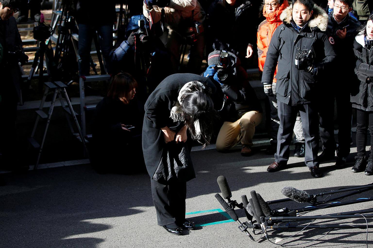 Cho Hyun Ah bowing in front of the media at the Seoul Western District Prosecutor's Office in Seoul on Dec 17, 2014.