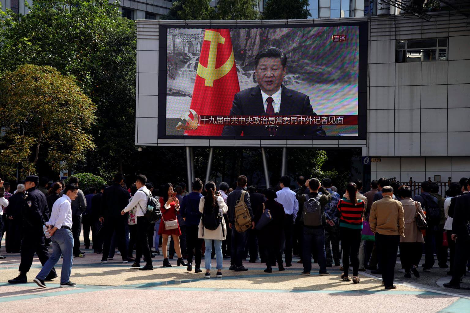 A live broadcast of Chinese President Xi Jinping introducing the Politburo Standing Committee is displayed on a TV screen in Shanghai on Oct 25, 2017.