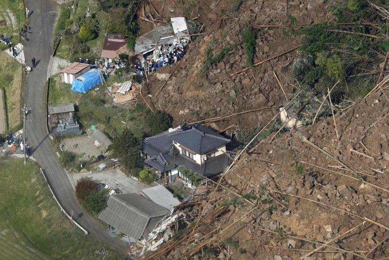 Rescue workers search for missing people at the site where houses were buried in a landslide at Yabakei town in Nakatsu, Oita Prefecture, southwestern Japan, on April 11, 2018.