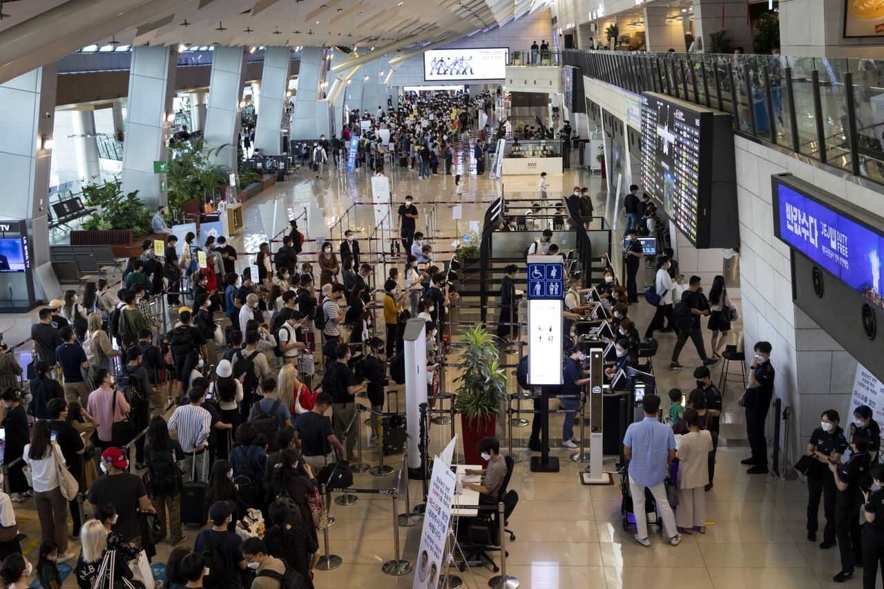 <p>Travelers wearing protective masks wait in line at a departure gate at Gimpo International Airport in Seoul, South Korea, on Friday, Sept. 17, 2021. South Korean financial markets will close from Sept. 20 to Sept. 22 for the Chuseok holidays. Photographer: SeongJoon Cho/Bloomberg</p>