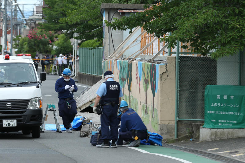 Police officers investigate the site where an elementary school student was killed after the walls next to the school pool had collapsed due to a magnitude 6.1 earthquake in Takatsuki, Osaka, Japan, on June 18, 2018.