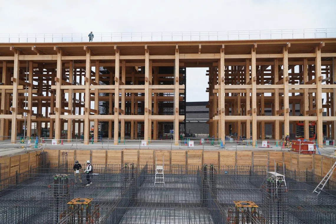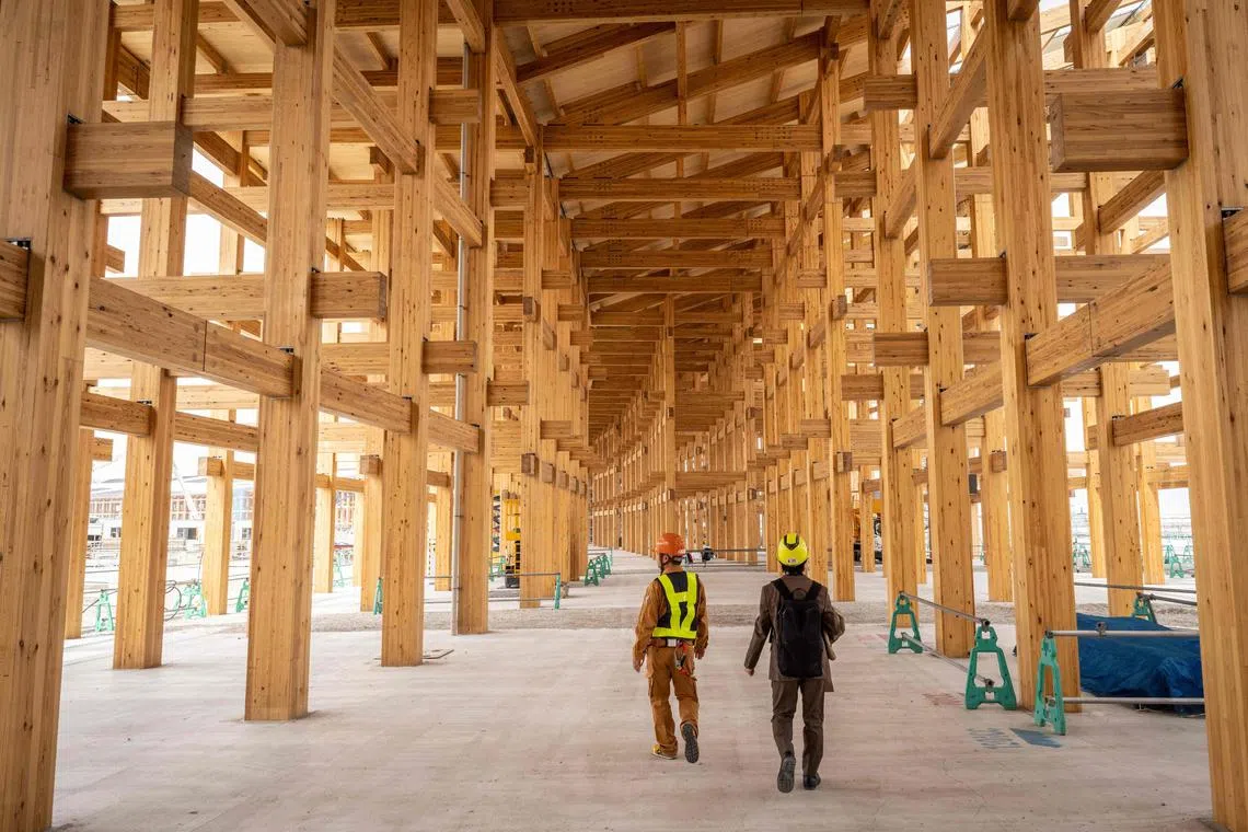 Workers walk under the construction of the Grand Ring, one of the world’s largest wooden structures, at the site of the 2025 Osaka World Expo.