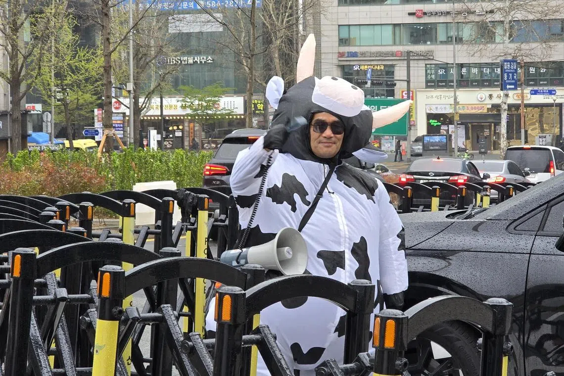 A man dressed up as a cow appeared outside the Seoul Central District Court on April 14.