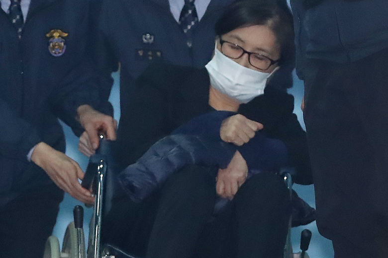 Choi Soon Sil, the central figure in ousted South Korean President Park Geun Hye's corruption scandal, is carried out in a wheelchair from the Seoul Central District Court on Dec 14, 2017.